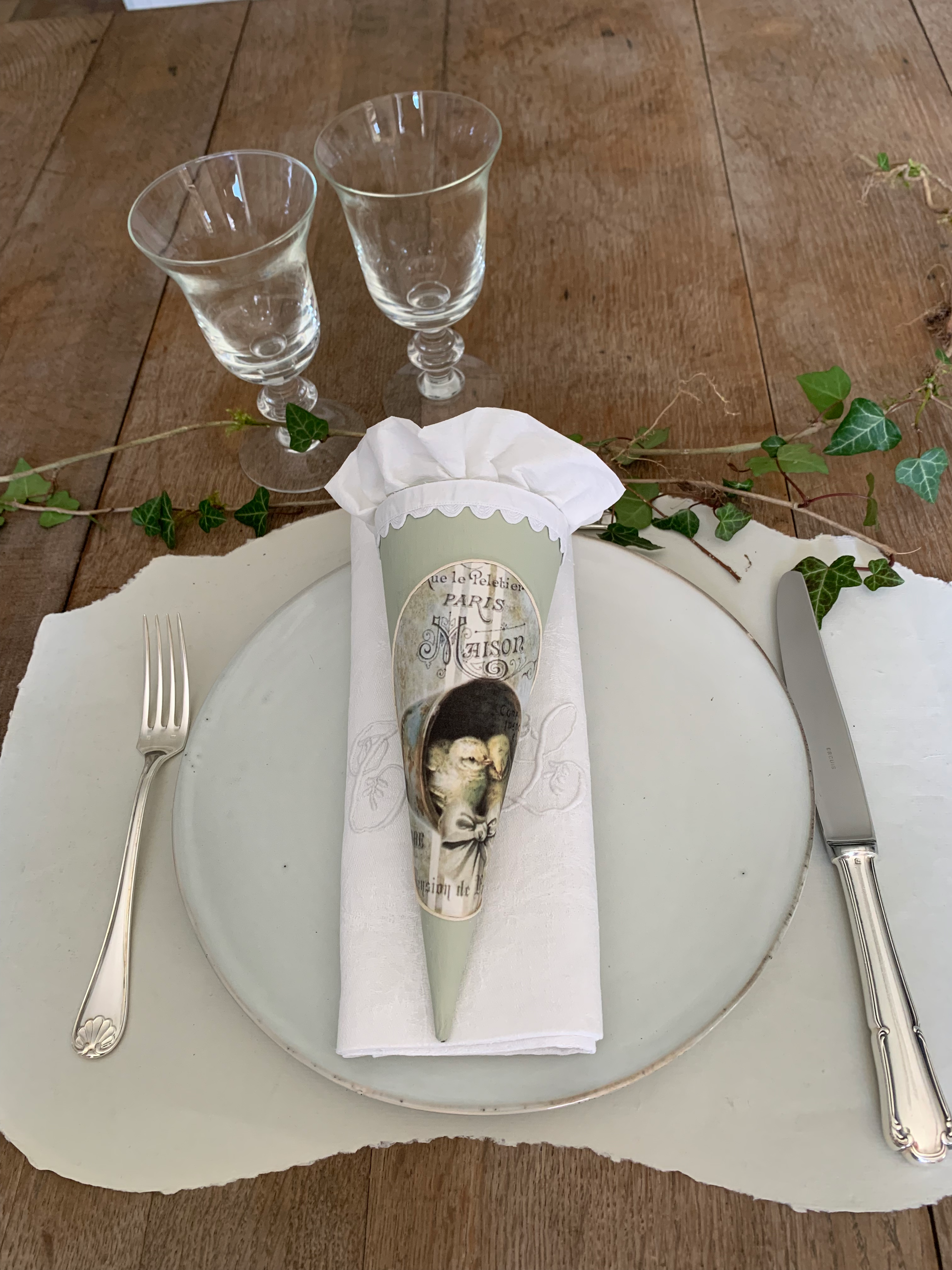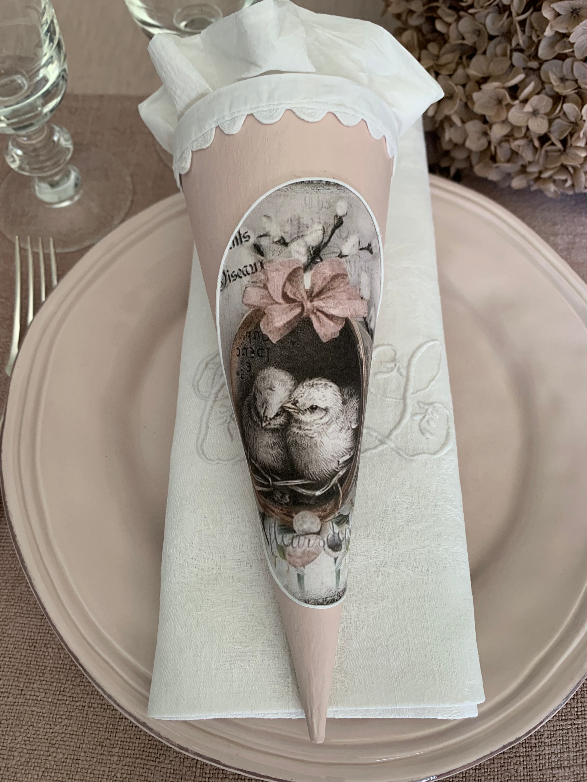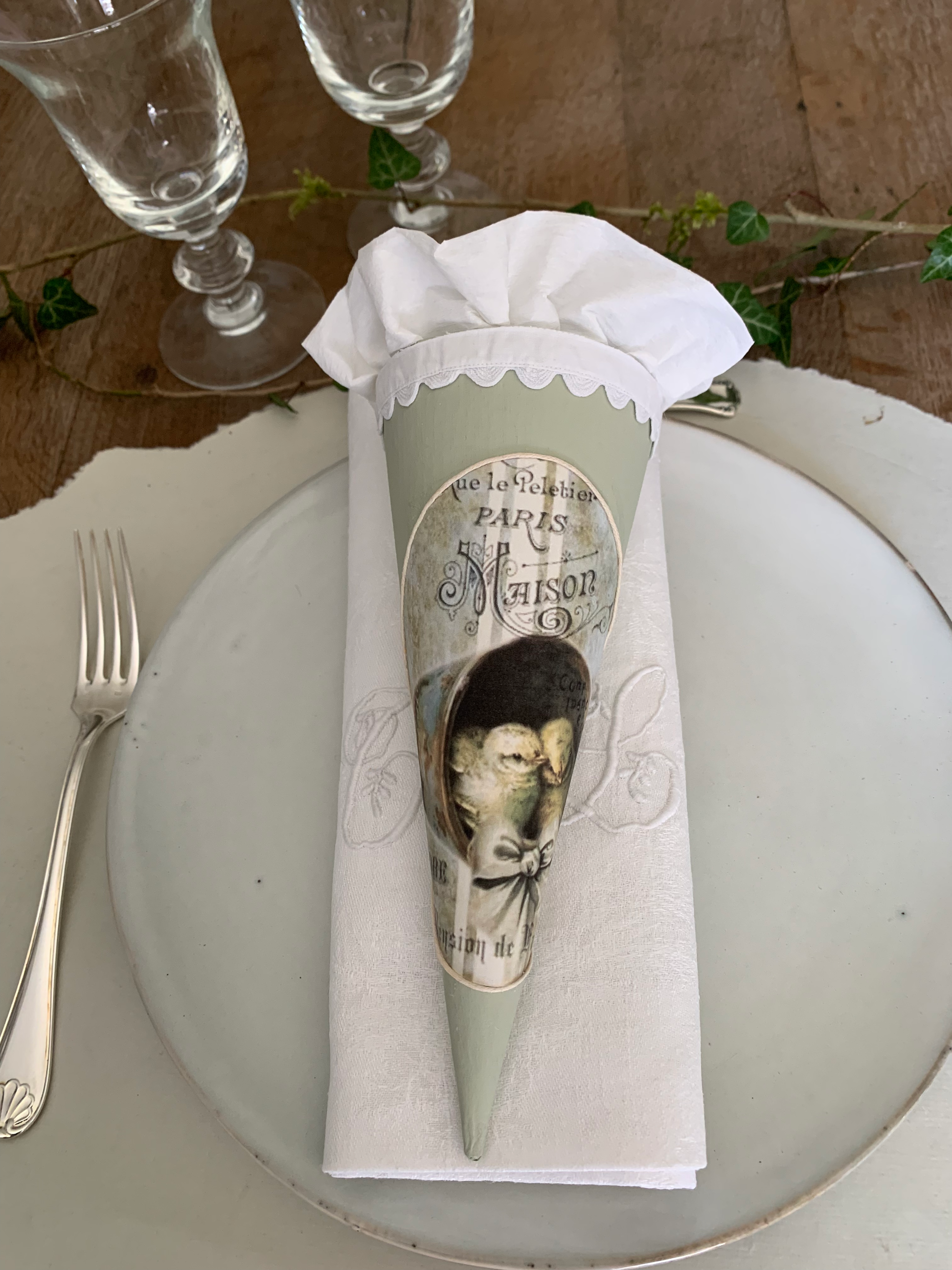 Pour la décoration de vos tables de Pâques ou tout simplement pour y glisser des chocolats, ce cône en carton peint est disponible en deux teintes délicates : « rose poudré » et « vert amande ». Chaque cône est décoré d’une image au charme suranné et agrémenté de dentelle ancienne, apportant une touche vintage et élégante à votre décoration.