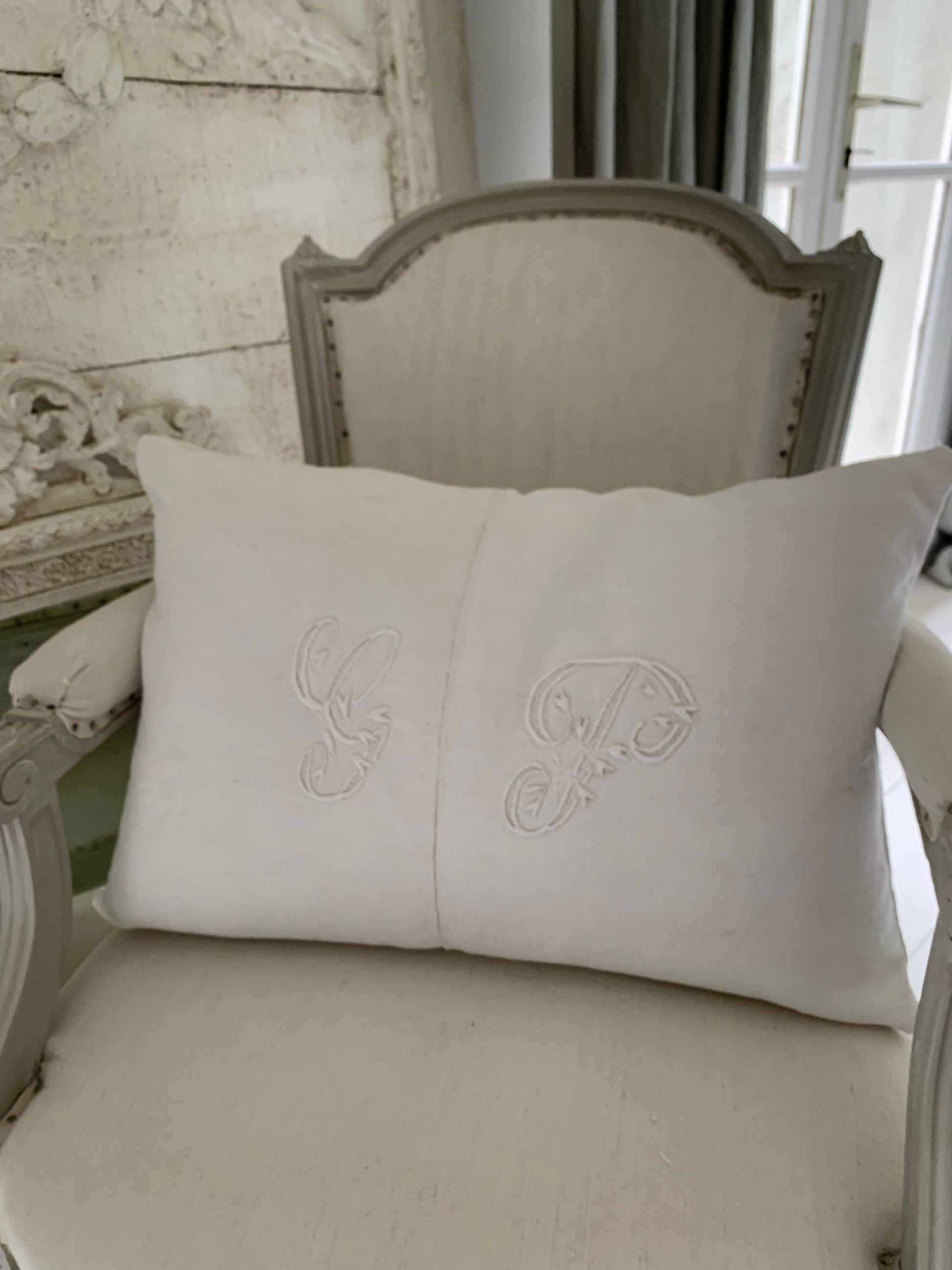 Simplicité et charme se rencontrent dans ce coussin en linge ancien, orné d’un monogramme brodé. Sa finition avec fermeture à glissière assure une utilisation pratique tout en conservant une esthétique élégante et intemporelle.
