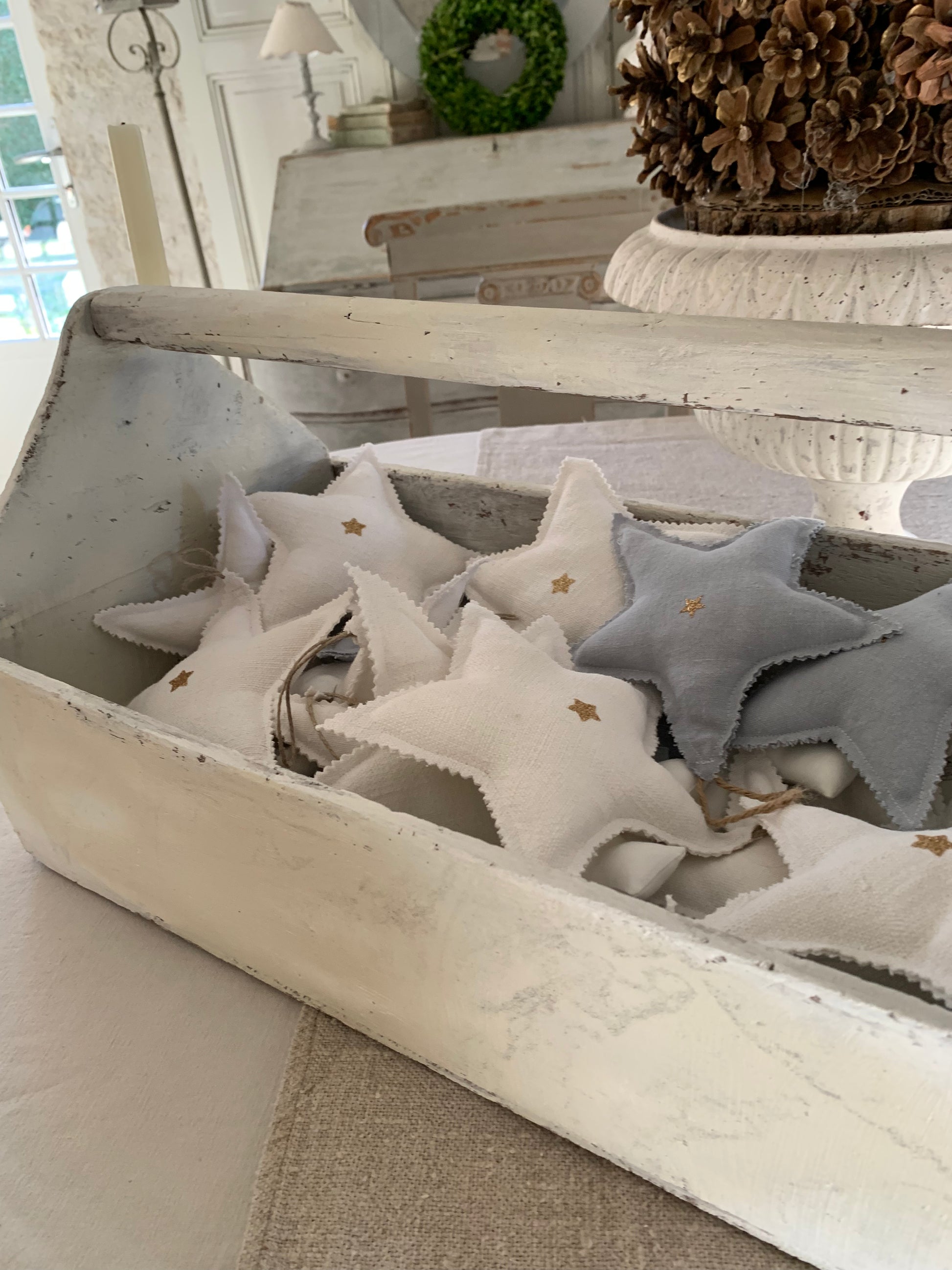 Ces délicates étoiles en chanvre, déclinées en blanc ou en bleu ciel grisé, sont sublimées par l’apposition d’une petite étoile dorée. Légères et poétiques, elles se prêtent à toutes les envies : accrochées à une poignée de porte, à un bouton de meuble ou suspendues dans le sapin lorsque Noël arrivera…