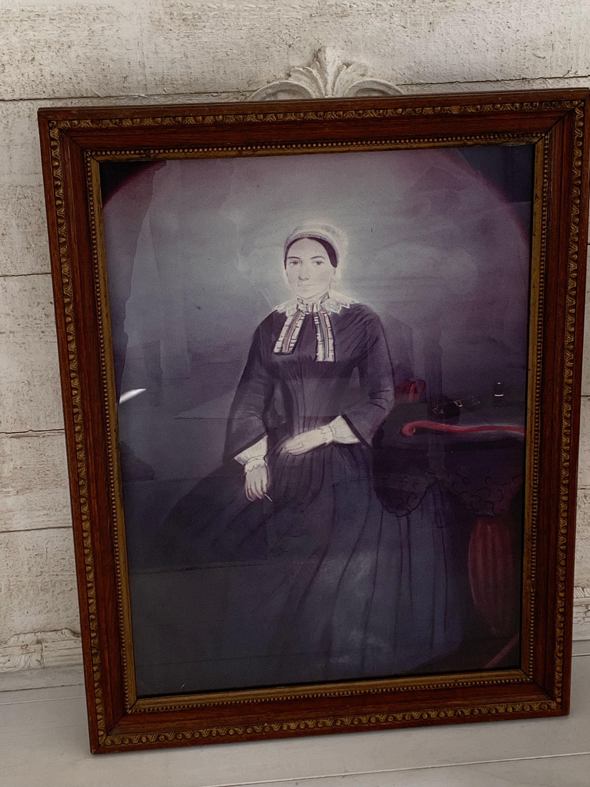 Cette gravure au fusain de 1851 représente Françoise Perruchot (grand-mère Faucheux) (1829-1903). Réalisée par un de ses amis étudiant en médecine pendant qu’elle faisait ses études de sage-femme à Paris, cette œuvre est encadrée dans son cadre d’origine. Le dos du tableau porte cette histoire unique. Cette réalisation illustre parfaitement l’interaction entre la lumière et l’ombre, propre aux dessins au fusain, connue sous le nom de « clair-obscur ».