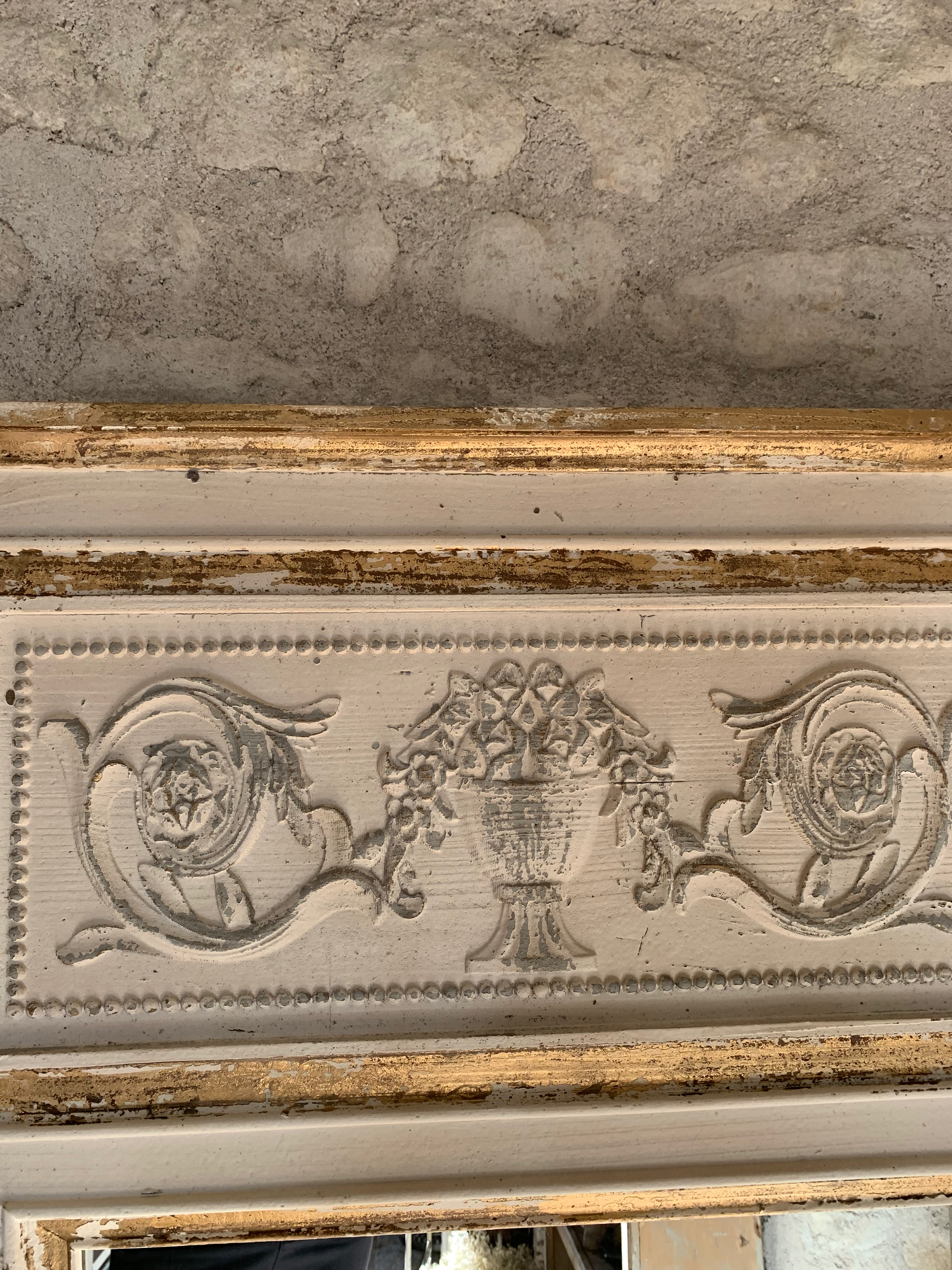 Ce magnifique miroir trumeau mural, à la patine blanc cassé et rehaussé de détails dorés, apportera instantanément charme et élégance à votre intérieur. Ses proportions généreuses en font une pièce forte et raffinée, idéale pour sublimer un espace.
